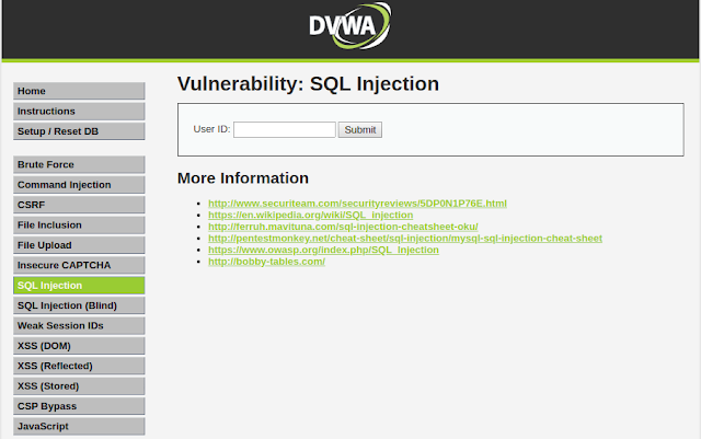 In this article we are going to perform SQL injection attack on DVWA, so let's jump in. On the DVWA welcome page click on SQL Injection navigation link. We are presented with a page with an input field for User ID.